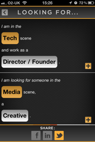 In your profile, you specify your job title, as well as the titles of others you want to meet. This is all done using a smart tagging system – no typing needed. (Hooray!) On your profile, where it reads “I am in the _______ scene and work as a _________” you can tap on the fields to switch industries (e.g. “Tech,” “Media,” “Marketing/PR, etc.”) and title (e.g. “Journalist/Blogger,” “Director/Founder,” “Architect,” etc.)