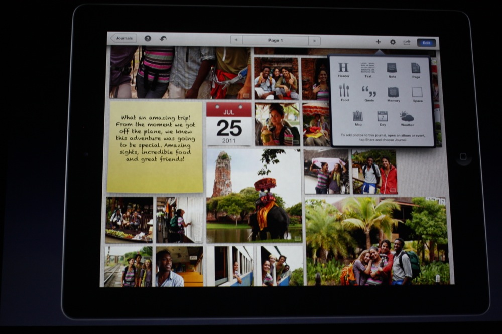 In typical Apple fashion, users can also add effects to their photos — think black-and-white and sepia filters, along with more complex tweaks like a tilt-shift effect. Perhaps the coolest addition to iPhoto for iOS though is the new Journal functionality, which can be used to create digital scrapbooks of sorts. Photos can be organized and resized on the “page” as desired, and users can throw in notes and maps to personalize the final product. I