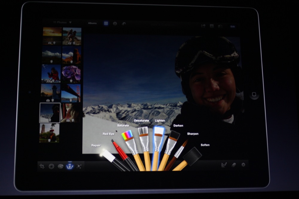Tapping a photo brings up the editing interface, and as expected, iPhoto for iOS is is chock full of multitouch gestures. Grabbing and moving corners will crop images for example, while touching images with the brush interface allows users to get very precise with their edits, and a downward swipe removes photos from a group. Once all those desired photo tweaks are in place, those photos can also be quickly beamed from device to device, or published directly to iCloud, Flickr, or Facebook.