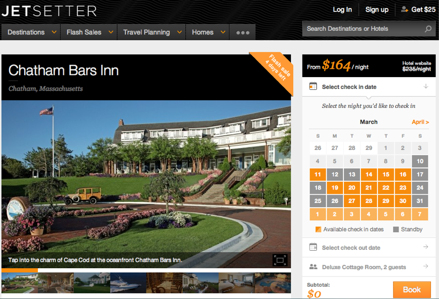 There are also two-to-three night getaways called Jetsetter Weekends, focused on a collection of inns and B&B’s outside of Jetsetter’s top seven markets (N.Y., Boston, D.C., Miami, L.A., San Francisco, and Seattle). Meanwhile, new “Style Steals” offer discounted rooms at hip, boutique hotels. Jetsetter also says it occasionally runs sales for properties that prefer the voucher format like the Trump Hotel Collection, The Peninsula Hotels, Marquis Jets, and Groundlink, for example.