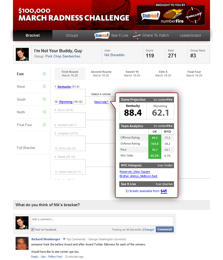The company just launched a new Facebook app called the March Radness Challenge. The problem, says CEO Nik Bonaddio, is that most people have no idea who’s going to win each game in the basketball tournament. That’s where numberFire comes in, bringing what Bonaddio calls a “MoneyBall-ish” approach to sports: “The data is there, so let’s use math and the power of big data/distributed computing to unlock the secrets of what’s actually going on, and then use that to understand what will happen next.”