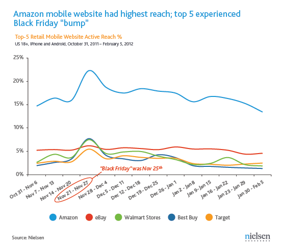 Nielsen also notes, for what it’s worth, that men are more likely to use apps than women, who opt for mobile web sites. And more men than women visited Best Buy on mobile, while Target and Walmart attracted more mobile women. eBay and Amazon, it seems transcend these lines, attracting both in equal measures.