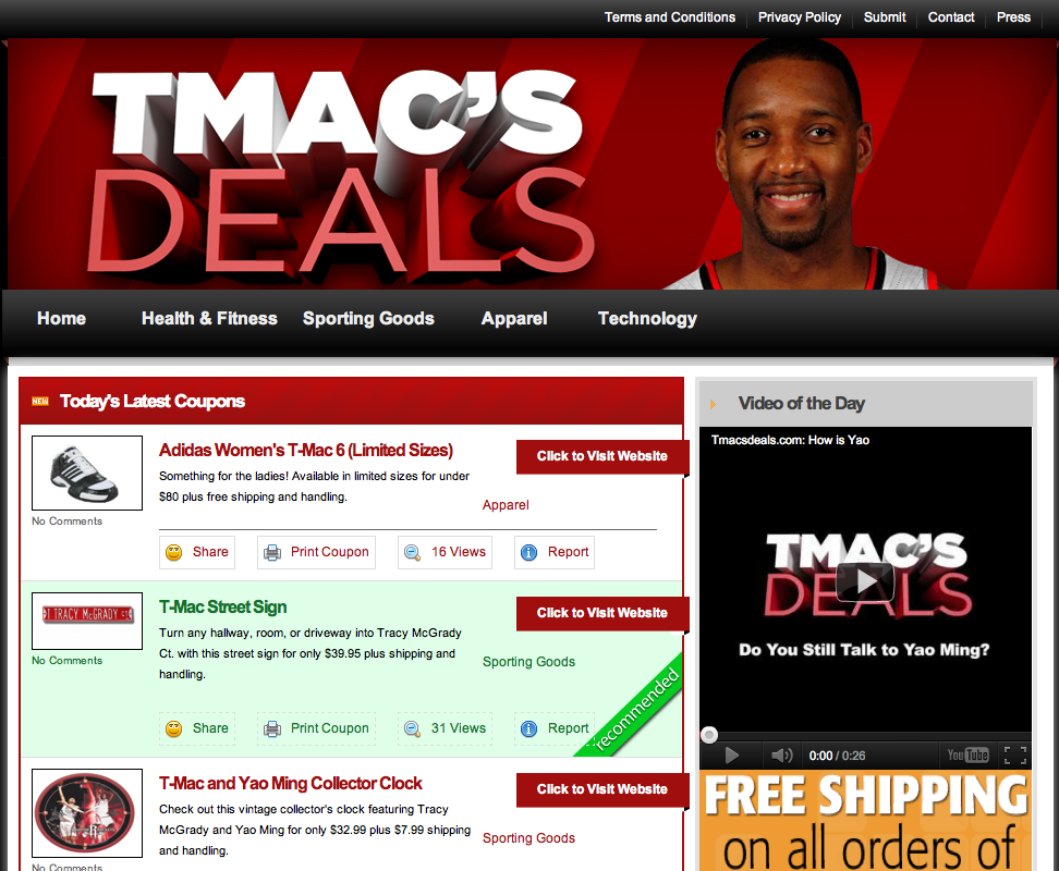 But professional athletes launching their own daily deals site? Not as much. In what is likely a first for the NBA (if not professional sports), we’ve learned that the NBA’s Tracy McGrady has launched his own daily deals website, called TMacsDeals.com. For those unfamiliar, McGrady is a seven-time NBA All-Star whose career has spanned 15 years and six different teams. The former scoring leader currently plays for the Atlanta Hawks.