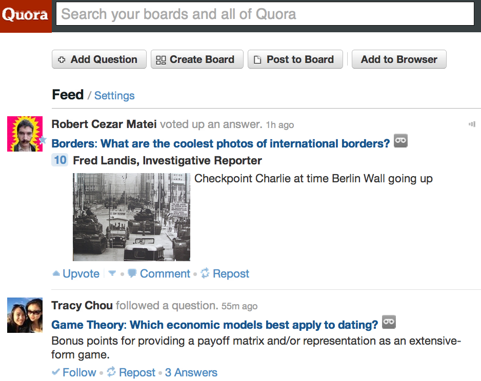 Concerning how a content stream for one user can be refined based on the tastes of their peers, this patent likely covers how Facebook decides which posts are relevant to show in the news feed. Posts by users or Pages that receive a lot of Likes and comments, especially from friends, are given more prominence in the feed. Pinterest likely uses the re-pins and likes of friends while Quora uses upvotes and answers to determine what to surface on a user’s home page.