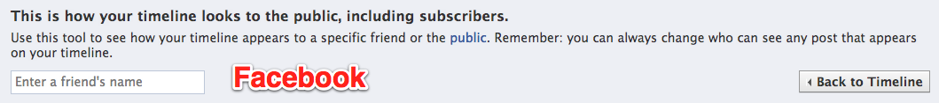 Facebook has long had a feature that lets you view how your profile appears to a specific friend or the public, and with the launch of Timeline the tool began appearing on profiles themselves. Just click “View as…” in the drop-down at the right of the Timeline profile.