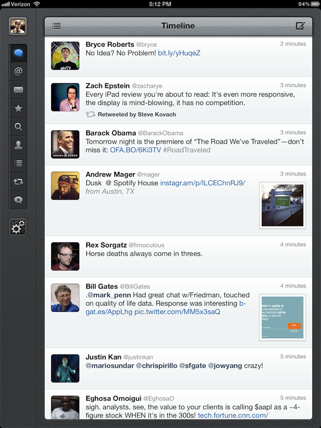 The only third-party app which I could find that was available as Retina-ready at the time of this review was Tweetbot, a Twitter client made by Tapbots. Pushed to the App Store yesterday, the difference side-by-side with the iPad 2 version is readily apparent.