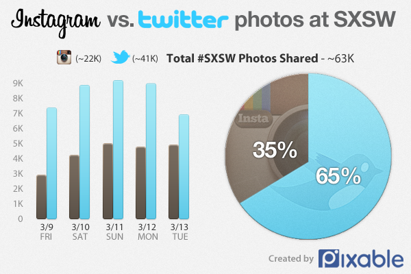 New stats provided to us by social photo aggregator Pixable show how this trend played out at the South By Southwest conference in Austin last weekend. The startup tracked all photos tweeted straight from Twitter or via Instagram, that contained relevant hashtags like #SXSW and #SXSWi.