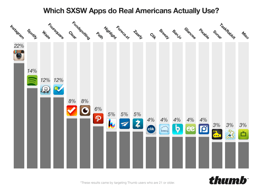 Now, you could make a list of caveats to the results that’s longer than this post. For starters: Do we really think Thumb’s userbase is fully representative of “Real Americans”? And doesn’t the survey’s definition of “SXSW App” seem a bit arbitrary? But I have to admit, I was still curious about the results, so here they are. The most-used app seems to be Instagram (22 percent of respondents said they used it), followed by Spotify (14 percent), Waze (12 percent), and Foursquare (12 percent). Highlight, the app that many predicted would be this year’s big hit, was used by 5 percent of respondents.