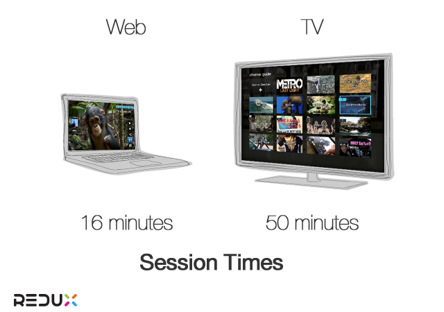 3. Appetite for content on the TV is higher than on any other connected device. The average returning session time for Redux users on the TV is nearly one hour compared to 16 minutes for Redux web users – that’s more than a 3X difference on the TV: