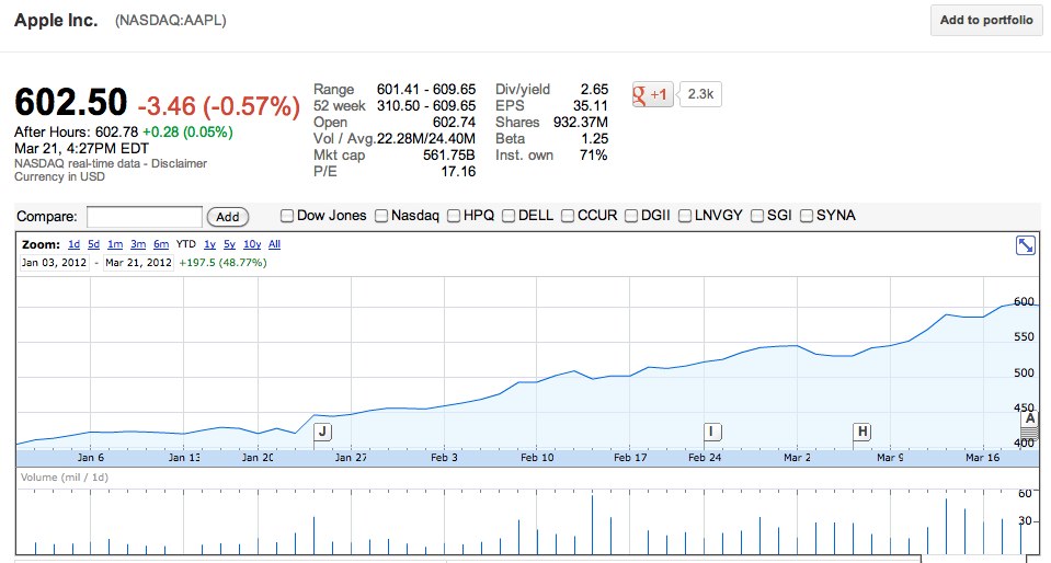 Apple is hot. I’m not talking about the temperature of the new iPads, I’m talking about its stock. At around 3pm ET today, Apple traded at a new all-time intraday high $609.65 a share, up more than 50% for the year. The stock finished 2011 at $405 and closed today at $602.50, up nearly $200 a share (+48.77%) year-to-date. One share is now worth more than a new 32GB iPad.