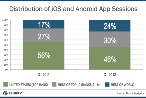 Flurry also looked at the numbers of app sessions over the past year. Since Q1 2011, the number of sessions in the U.S. has more than doubled, however, its share of total sessions has declined from 56% to 46%. This is a reflection of the U.S. market’s maturity, to some extent: it’s still growing, but other countries are growing more quickly. When combining the #2 through #10 ranked markets (China, the U.K., South Korea, France, Australia, Canada, Japan, Germany and Spain), sessions have collectively increased 3.4 times from Q1 2011 to Q1 2012, and session share has gone from 27% to 30%. The rest of the world combined has gone from 17% to 24% during the same time, or 4x growth.