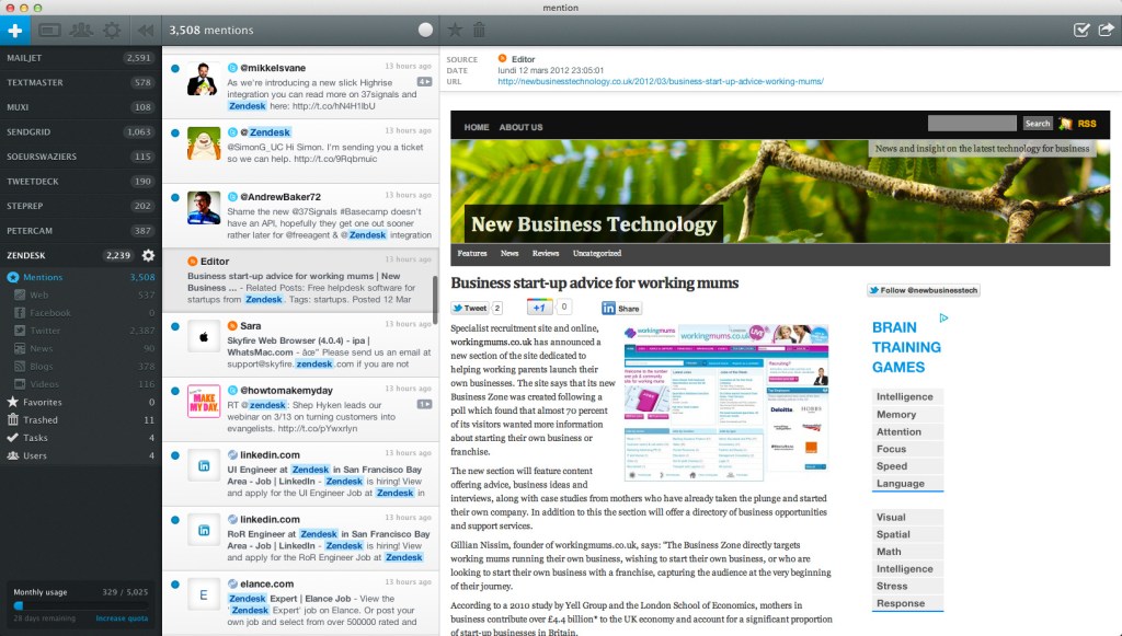 Mention, which was built using newer technologies like backbone.js, node.js, Qt and Webkit, is available now as a web app, a Chrome app, as downloadable software for Windows, Mac and Linux, and will arrive on the iPhone in two weeks, with an iPad app and Android app to follow.