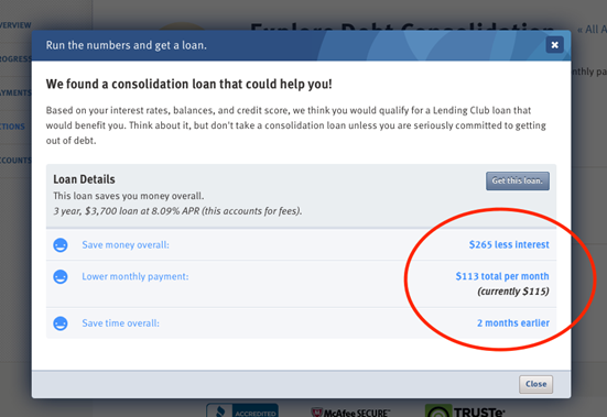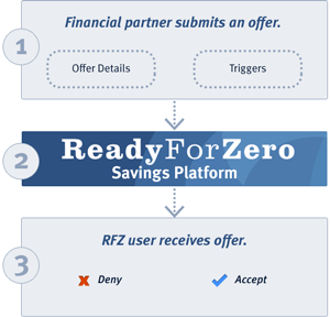 For example, when suggesting a consolidation loan, ReadyForZero would show the user how much money they would save, what the interest rate would be, how much the monthly payments would be reduced by, and how much quicker you would be able to pay off the debt. Likely, the user would then accept the offer, and only then would the financial institution be introduced to the customer in question.
