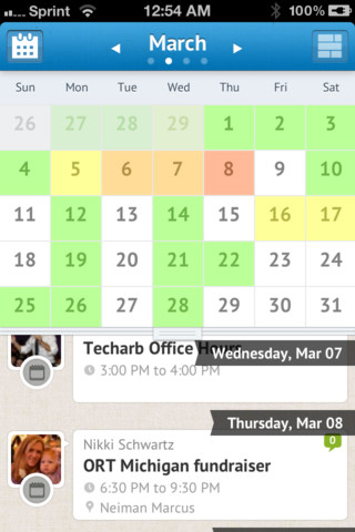 This also works both ways, which is smart, since you can add events to GCal, for example, from within UpTo. The apps also lets you get a sense of the activity level of your calendar by providing a heatmap view so that you can which days or busiest for any particular group. Also a good quick way to measure virality of particular events. (See image below.)