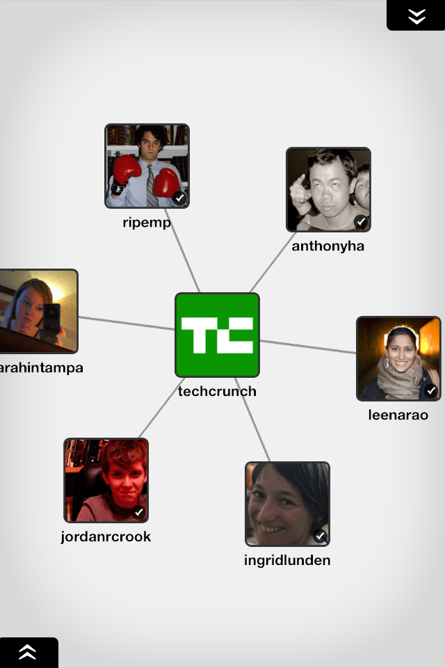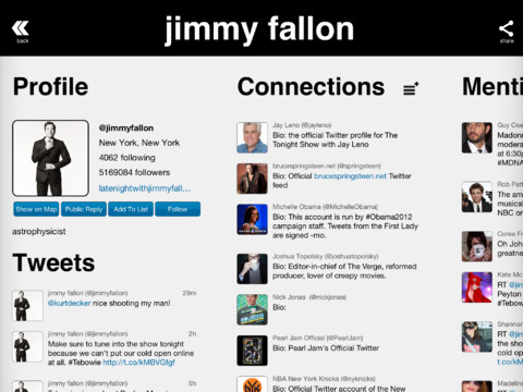 After the initial network is displayed, you can then tap on any one of the connections to then see their related “spokes” expand outwards. You can also tap and hold for quick access to the Twitter bio and a button to follow/unfollow the user as you see fit.