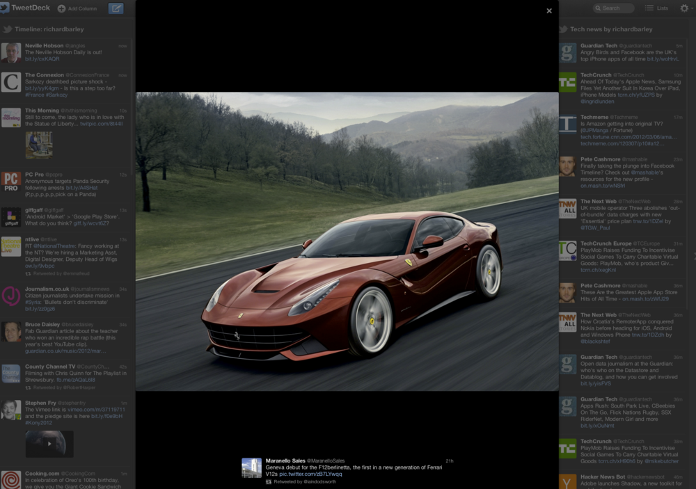 Adding a little UI polish to the update, TweetDeck now supports inline media previews, which shows you the images and videos related to a tweet without requiring you launch a separate window or webpage. Instead, these will appear directly within the stream. (If you don’t like this option, you can switch it off in the settings, however). Large previews, which display in a gallery view, are also available, and are accessed by clicking the image or URL contained in the tweet.