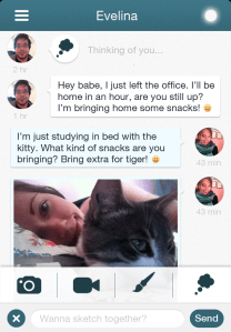 Once they “pair” with you, you’ll be put into the app together. The interface is organized like text messages. You appear on the left, your partner on the right. But you’ll get an impressive range of options for how to stay in touch. There’s simple messaging, videos and photos (complete with the option to touch them up in Camera+). But there’s also a “thinking of you” button, which is a simple notification that’s most similar to Facebook’s classic Poke.