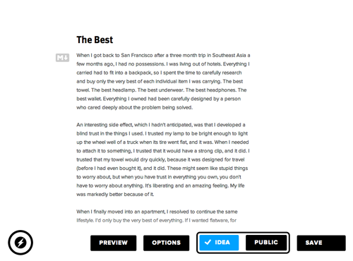 The idea is that the design of the blogging platform should be a vital part of the creative process, that helps some of the best minds in the business refine and present their thoughts. The interface includes a section for brainstorming ideas, and an easy flow for turning them into posts. It removes the array of options, like advanced markup features that you’ll see on WordPress and other established platforms, to focus writers on core ideas.