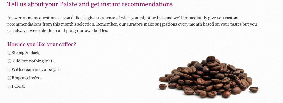 The site is obviously up against some heavy hitters, including Wine.com, Wine.Woot, and the elfin Gary Vaynerchuk’s Wine Library. However, by taking a page from other viral sales sites, the company seems to offer a considerably more targeted offering thanks to the taste assessment system and rugged, handsome curators shot in grainy black-and-white.