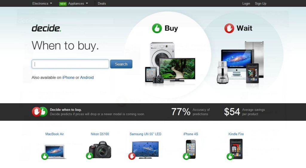 Now at work on tracking pricing and product changes in other industries, the team is using their expertise to develop new techniques for analyzing different sorts of market fluctuations. Decide doesn’t just compare current prices and availability for the products it watches, as a shopping portal would, it also knows of product release cycles, historical trends, company announcements, news and rumors published by the media, and more. All of these items come into play when Decide makes its “buy” or “wait” recommendations.