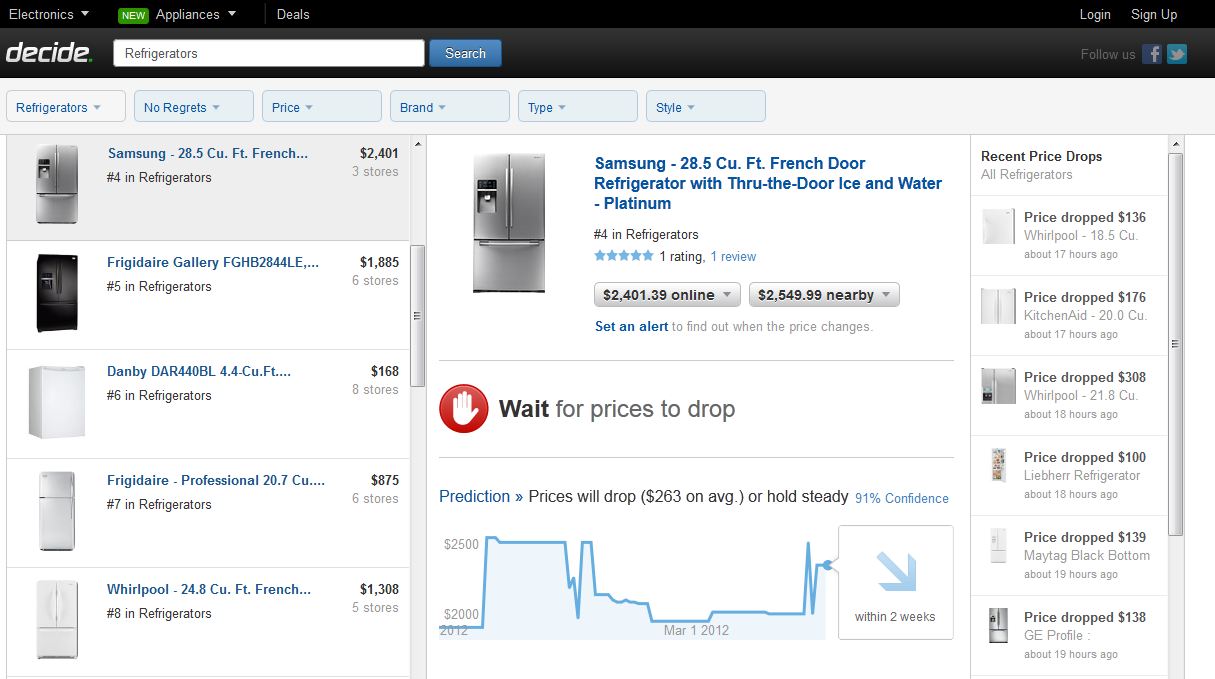 For those unfamiliar, Decide.com is a search engine of sorts that tells you whether or not to purchase a gadget, computer, or now, an appliance, that you have your eyes on. Created by Farecast’s former VP of Marketing and Product Development, Mike Fridgen, as well as Farecast co-founder, now Decide CTO, Oren Etzioni, the engine is somewhat reminiscent of their first product Farecast, which told consumers the best time to buy a plane ticket. That company was later acquired by Microsoft for $115 million.