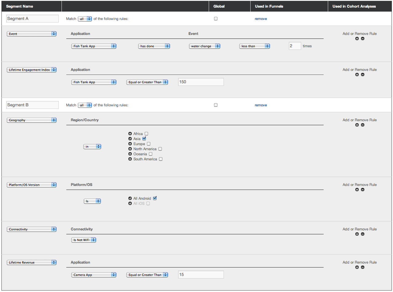 An app maker can target users based on how much they spend, their location, their lifetime value, their engagement level, whether they use iOS or Android, or custom events like whether they got past Level 5 or opened a shopping chart.