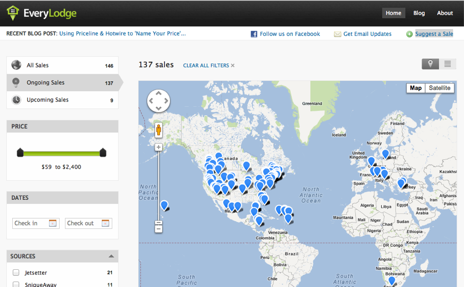 On the company’s homepage, these sales are plotted on a map, and can be filtered by status (ongoing or upcoming), price, check in and check out dates, and source. When a user is ready to book, they’re directed to the source of the sale itself. It’s unclear how the services being sourced will react to this launch – will they look upon EveryLodge as a helpful provider of referral traffic, or will they be upset that it’s managed to tap into some of their exclusive, private deals?