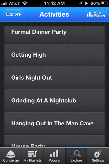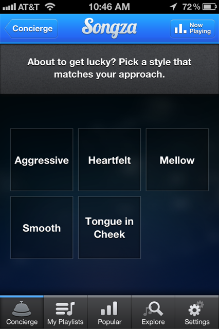So let’s say I’m hypothetically getting lucky… Songza will offer me certain filters for that particular “activity” like Heartfelt, Aggressive, Tongue And Cheek, Smooth, and Mellow. Unfortunately, the Concierge feature which launched in an update last week is only available on iOS and the web right now.
