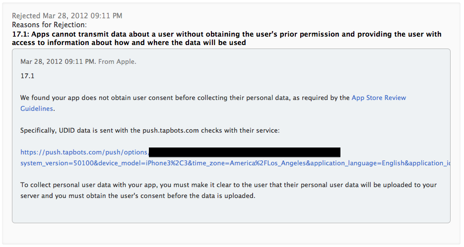 “There is literally not one developer’s app that we could find that had a rejection due to UDID alone,” said Peter Farago, who is vice president of marketing at Flurry, a mobile analytics company that serves more 160,000 apps.