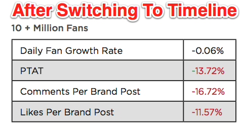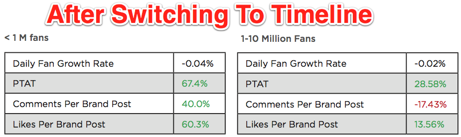In the first week after Timeline for Pages launched 8 million Pages voluntarily switched over, but limited early data showed the migration significantly reduced the rate at which big pages were gaining fans. But data from Wildfire’s much more comprehensive study of 43 brands had rosier results.