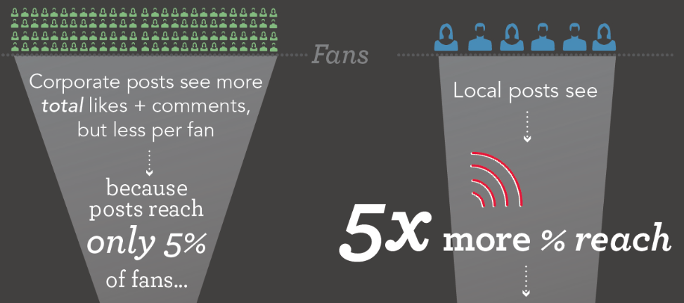 There’s more good news for smaller Pages. A study shared with us by enterprise marketing platform Hearsay Social shows local business Pages with fewer fans get 5x more exposure in the news feed, and 8x more of the fans reached will engage with a post. That means big brands with lots of local branches can get 40x the engagement by having a Page for each store.