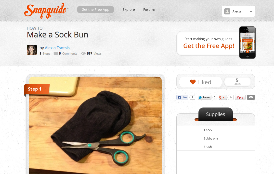In order to make a guide, download Snapguide onto your phone, take a series of pictures (or a up to 60-second video) delineating each step in your process (Like, ‘Step 1. Cut a hole in a sock’ for my “How to make a sock bun” guide). Then fill in the text instructions. Because Snapguide is optimized for iPhone, you can also speak in your text and the app uses Nuance technology to transcribe it.