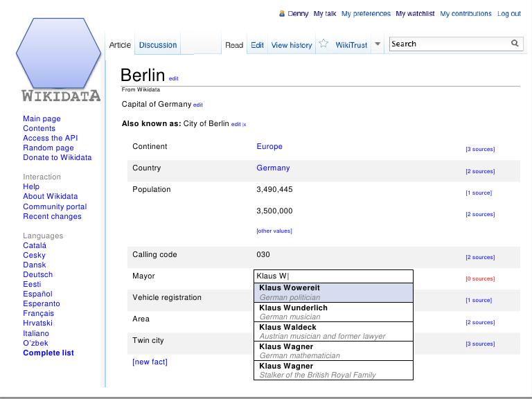 In terms of how Wikidata will impact Wikipedia’s user interface, the plan is for the data to live in the “info boxes” that run down the right-hand side of a Wikipedia page. (For example: those on the right side of NYC’s page). The data will be inputted at data.wikipedia.org, which will then drive the info boxes wherever they appear, across languages, and in other pages that use the same info boxes. However, because the project is just now going into development, some of these details may change.