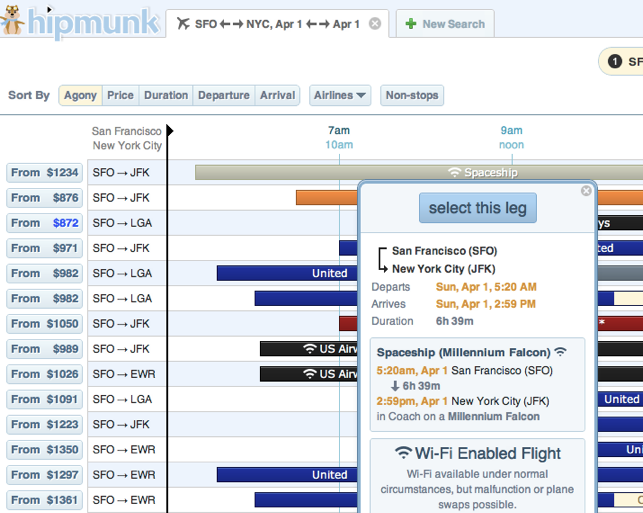 Hipmunk — Sure, flying on an airplane is cool, but as face-melting technology goes, we’re like totally over it. We also want some more destinations … no more of this “LAX –> JFK nonsense. Thanks to flight-booking service Hipmunk, now you can book yourself a spot on the Millennium Falcon. (Unfortunately, Chewy has already eaten all the peanuts.) They’re also offering options like hot air balloon, dog sled, rickshaw, African swallow, stagecoach, and other enjoyable ways to get to where you need to go.