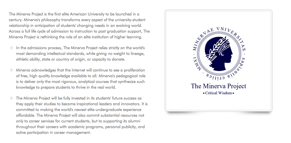 Right now, this all sounds pretty audacious, in both the right ways, and perhaps in slightly delusional ways as well. And to that point, the cherry on top? Minerva will begin accepting its first class in 2014. Yup. Audacity of hope aside, Minerva is building on principles that will resonate with many people, young and old.