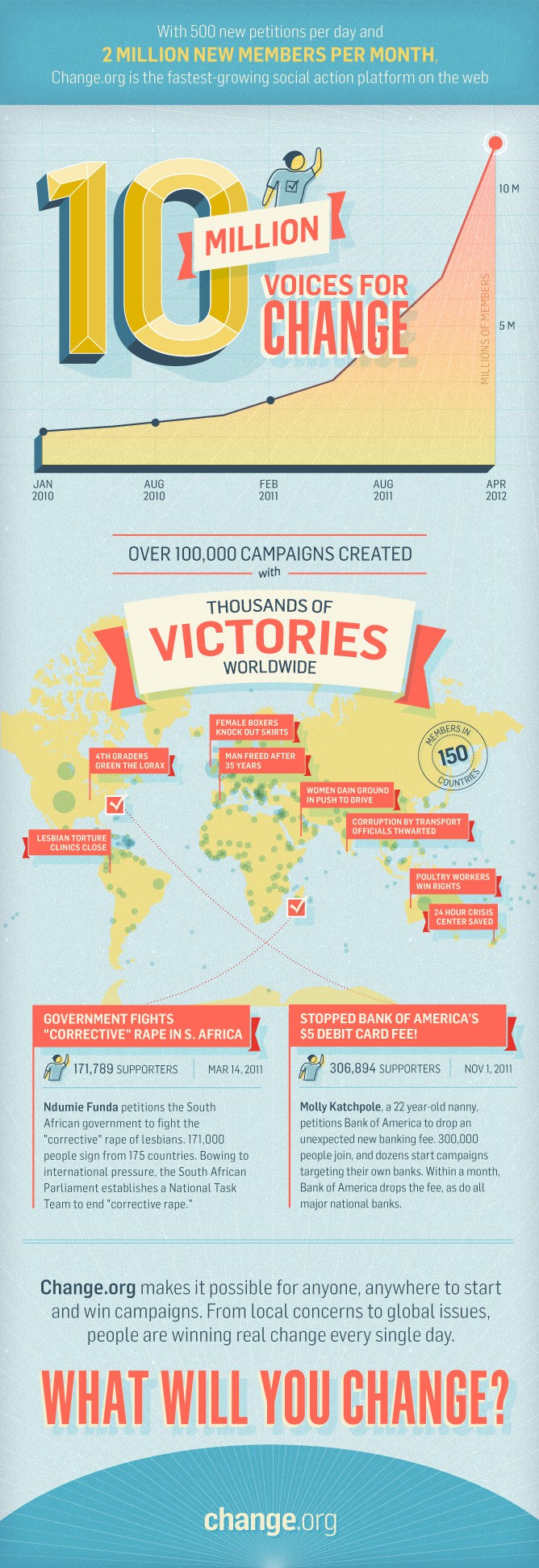 To celebrate its 10 millionth member, Change.org also put together this infographic: