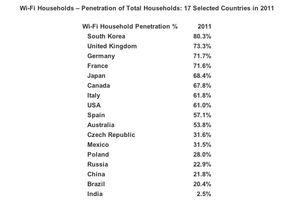 In the U.S., 61% of all households currently have WiFi networks installed at home. According to data from Strategy Analytics, this means the U.S. is ahead of countries like Spain (57.1%), Mexico (31.5%) and India (2.5%). At the same time, though, this only puts the U.S. somewhere in the lower half of WiFi adoption among developed nations. In countries like South Korea (80.3%), the UK (73.3%) and Canada (67.8%), significantly more households currently have WiFi networks installed.