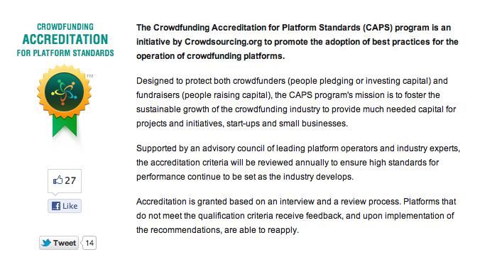 Crowdsourcing.org, a neutral professional association and industry resource that offers news, articles, videos, and site information on all things crowdsourcing and crowdfunding, has established the Crowdfunding Accreditation for Platform Standards (CAPS) program to create standards for crowdfunding operations, and while the industry creates self-regulatory frameworks, CAPS has been designed to govern the accreditation of crowdfunding platforms.