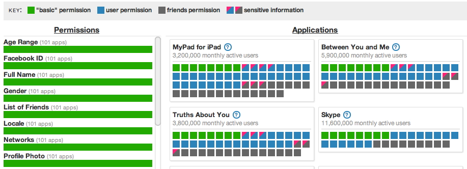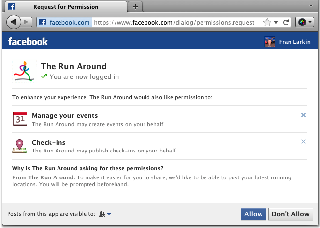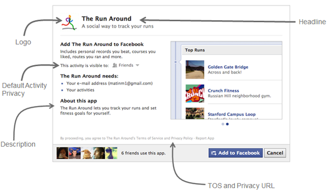 When you go to install an app, you’re first shown a description of what the app does, what data it needs such as your email address or your friends’ photos, and you’re able to select who can see your in-app activity. If the app requires more than biographical information and the option to publish to your wall, it has to show a second screen listing every type of data or ability it needs. It’s probably the most privacy-sensitive process for granting access to personal data on the Internet.