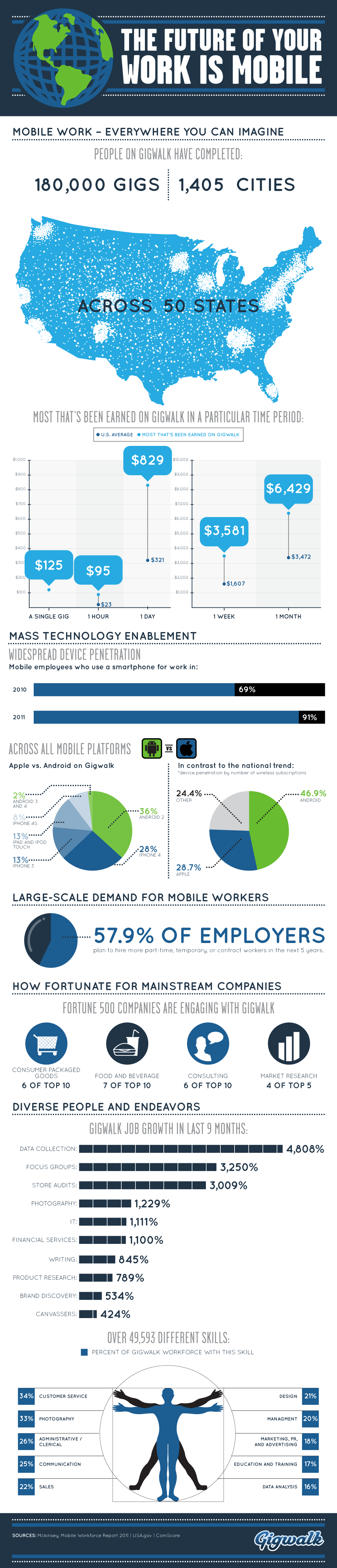 Currently, Gigwalk has around 130,000 workers in its network to help businesses find the right workers for the right jobs. When evaluating a candidate, businesses can see the number of Gigs each applicant has completed, the applicant’s highest level of education, his or her current occupation, and his or her on-time rate.