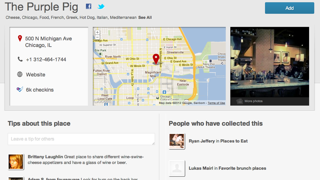 The site allows you to sign in via Twitter, Facebook or Foursquare, and plans to further integrate with social services to aggregate your own checkins in a list called “Places I’ve Been.” (This feature did not appear to be live at the time of testing.) It does, however, currently aggregate the number of checkins a venue has from Foursquare to indicate its popularity.
