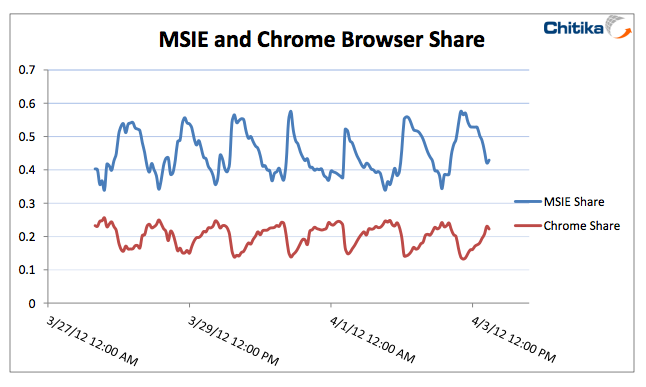 Chrome’s peak use was 24.6% throughout the week to IE’s average peak use of 55.3%. And no, Chrome never – even briefly – topped IE in terms of overall share.