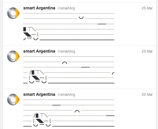 Now this is a pretty nifty use of a corporate Twitter account. Smart Car’s Argentinian division has filled practically its entire Twitter stream — which is currently 456 tweets long — with ASCII art images that turn into a stop-action movie when you scroll through them.