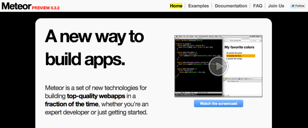 Without stumbling through a more technical description, for a little more on that, you check out the site’s FAQ, Meteor’s goal seems to be to radically simplify the process of building powerful apps, apps that will be prepared “to handle the next two decades of technological change.” As developing apps and writing software is a painful, demanding process, Meteor wants to find a new way to create software that is simple, elegant, and is accessible to as many people as possible.