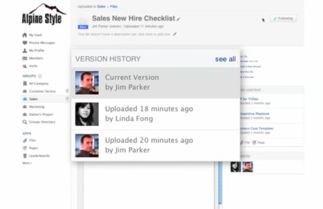 In terms of social discovery, each Yammer file will live at a unique URL (or permalink) where it can be viewed in the browser, followed, shared and discussed. Following a file will notify the user of changes. Users can also view a revision history. These files can be accessed on mobile devices and then shared or emailed from there. And opening or saving new versions will generate an activity story in the Ticker, the scrolling real-time activity feed in Yammer.