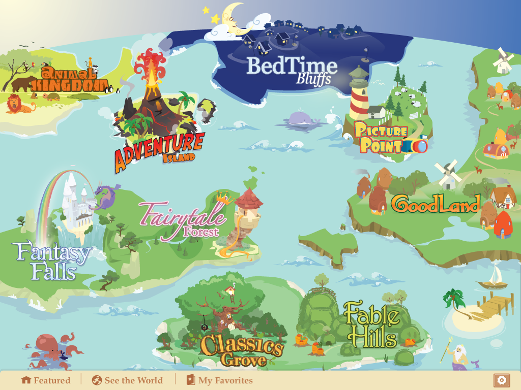 The “world” he’s referring to is FarFaria’s map of make-believe lands where stories are grouped by genre. For example, “Picture Point” island, when tapped, takes you into a collection of picture books meant for toddlers. “Fairytale Forest,” “Fable Hills,” and “GoodLand,” are some of the others, with the latter focused lessons like not being greedy, offering to help, etc.