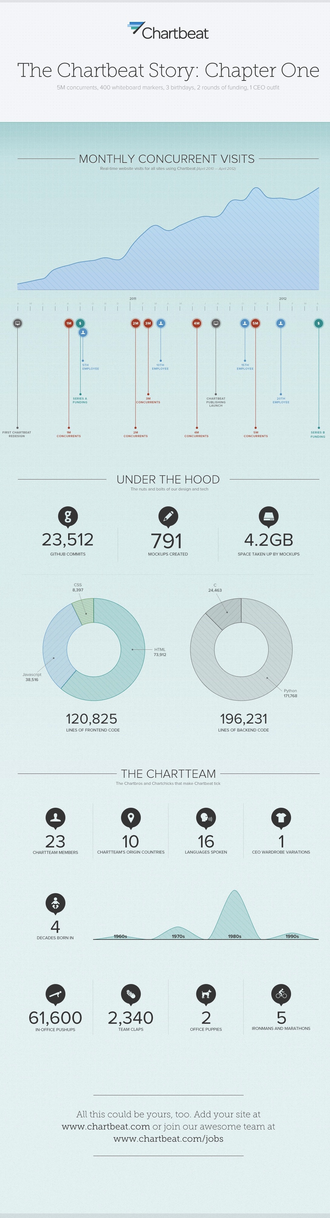 Oh, and in addition to all the news, this is also Chartbeat’s third anniversary. To celebrate, it created an infographic charting its growth. Now I’m not thrilled with the current flood of infographics, but as you’d expect from a company that’s built around data visualization, this one’s pretty good, sharing data points that are serious (5 million concurrent visitors to Chartbeat websites!) and less so (61,600 in-office pushups!).