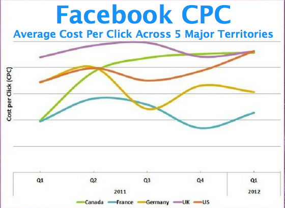 Looking year over year, some of Facebook’s numbers are even stronger. CPM climbed from $0.21 to $0.296 on average across the U.S., UK, Canada, France, and Germany over Q1 2011. Since Q4 2011, CPM rose 11% in the U.S. and 13% in the UK, indicating its most important markets are still strong. Meanwhile, Facebook has managed to boost CPC 35% in France and 20% in the U.S., with average U.S. CPC up 34% since Q1 2011.