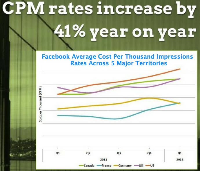 While Google’s advertising cost per click fell 6% since Q4 2011, Facebook keeps commanding higher prices from advertisers with CPC up 23% in key markets during same period according to a study of the last full quarter before the social network is expected to go public. It seems the shift to mobile where users are harder to monetize hasn’t phased Facebook’s ad rates yet, which could make its stock very appealing come IPO day. Ads tool developer TBG Digital saw the average cost per thousand impressions (CPM) of the ads it runs on Facebook increase 15% over Q4 2011 and a whopping 41% over Q1 2011 in key markets.