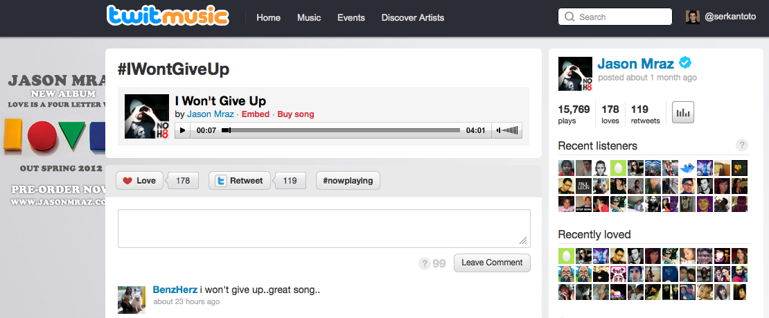 Existing Twitter users can log in to leave comment on tracks, “love” them, re-tweet them, or share links with followers using the #nowplaying hashtag with one click. Users can also embed individual songs elsewhere, download them (here‘s a pretty popular, downloadable one), or buy tracks on Twitmusic via iTunes.